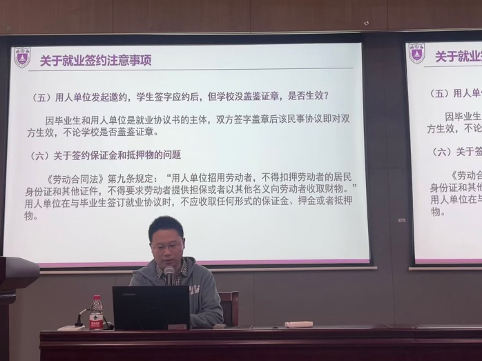 王老师重点介绍了“签约就业”的有关内容。他就签约的法律性质进行了详细的解释。他希望同学们多通过就业中心,利用公司、员工的资源了解企业的基本情况,警惕企业的虚假宣传。签约流程上,王老师对不同单位的签约特点进行了解读。他特别叮嘱同学们应诚信签约、理性签约,维护好南大毕业生平台。细节层面上,王老师表示要注意签约和解约的方式方法,一定要注意违约的具体条件、附加条款等事项。王老师还就应届毕业生身份保留等问题进行了说明。