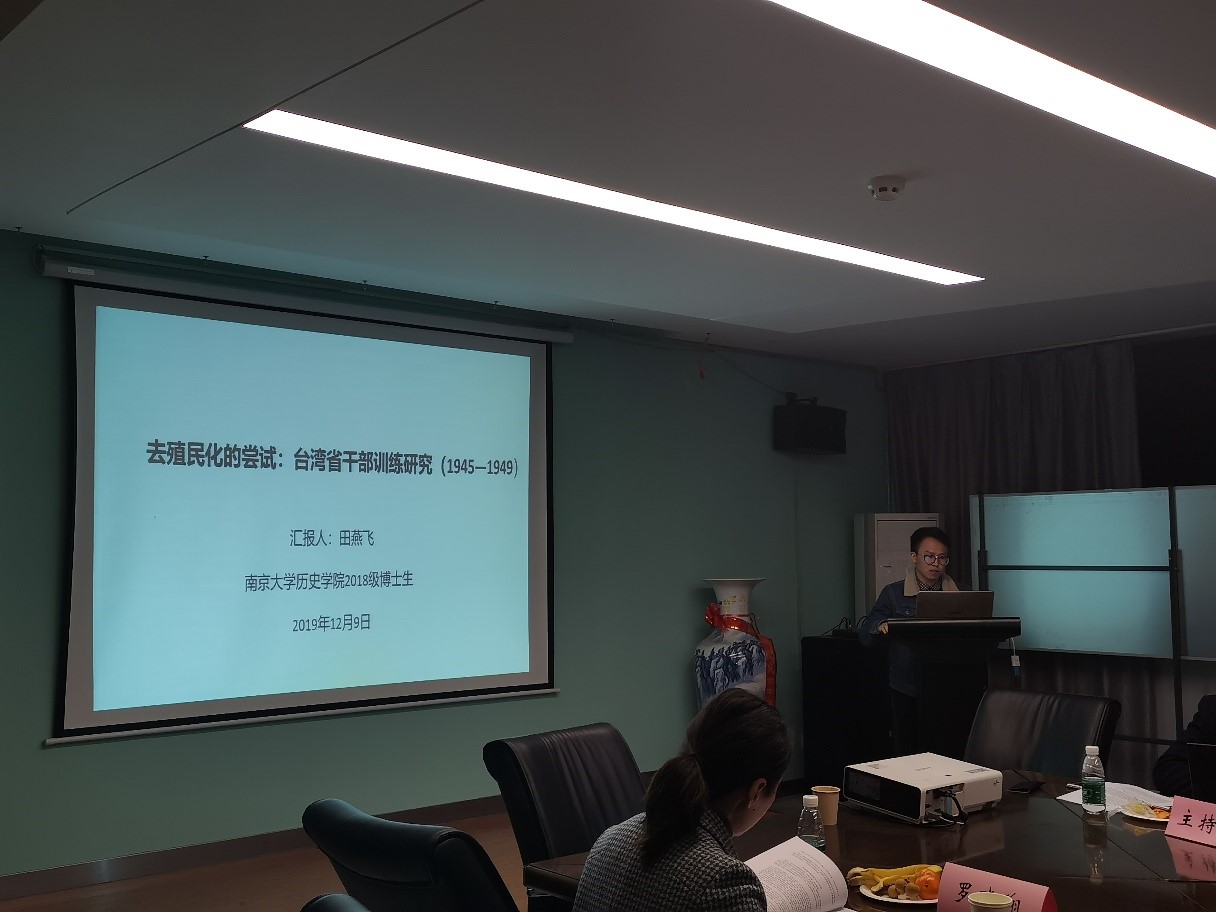 第二位报告人是中国近现代史2018级博士生田燕飞,题目是《去殖民化的尝试:台湾省干部训练研究(1945—1949)》。该文从实证研究出发,在充分利用台湾地方档案资料的基础上,详细论述了台湾光复后国民政府成立的以训练该省地方行政干部为主的“省训练团”的创建缘起、建设过程以及存在的不足,最终导致了其“短暂命运”。最后,作者分别从历史延续性、价值传递、成效等方面总结指出,台湾从“主权回归”后向“文化重建”的转型和发展,促使台湾省干部训练团的成立,干部训练团的创建是国民政府在台湾去殖民化方面的尝试,不仅对当时台湾建设有积极意义,时至今日,仍有重要的参考价值。