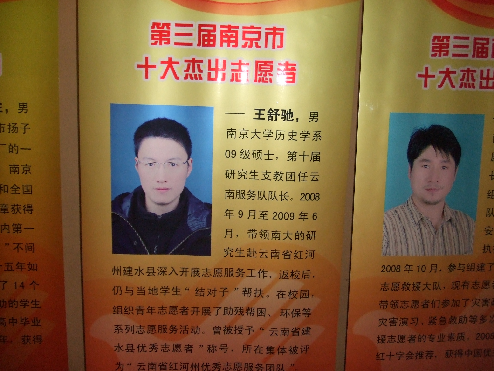 3月5日是“学雷锋纪念日”,也是“南京市志愿者日”。共青团南京市委联合多家单位和媒体在山西路青春剧场举办了“志愿服务青奥行动”启动暨第三届“南京市十大杰出志愿(志愿服务集体)”颁奖仪式。会上,市委常委许慧玲、团省委副书记张国梁等领导出席会议并为获奖者颁奖。我系王舒驰同学获“南京市十大杰出志愿者”称号,并在颁奖仪式后进行了个人事迹宣讲。 王舒驰同学系我系中国近现代史09级硕士,威廉希尔官网第十届研究生支教团云南服务队队长,于2008年9月至2009年7月赴云南省红河州建水县开展志愿服务工作。他的获奖,是我系长期重视员工思想道德工作的成果,也是我系广大同学心怀爱心、乐于助人,积极服务于社会主义和谐社会的重要体现。