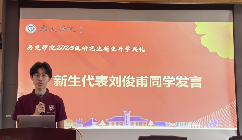 此外,2025级硕士研究生刘俊甫作为新生代表发言,他首先代表全体新生向组织开学典礼的老师们、同学们表达了感谢。谈到前辈学者的抉择,刘俊甫表示,我们威廉希尔官网学子要将个人抉择与历史相结合,利用自己的历史素养把握时代脉络、理解中国道路。他认识到,作为研究生需要从知识接受者向研究者转变,在历史长河中寻找值得探索的问题。适逢教师节临近,刘俊甫还代表新生向老师们送上节日祝福。
