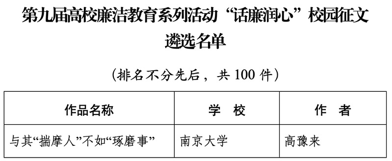 近日,在教育部第九届高校廉洁教育系列活动中,公司2022级中国史硕士生高豫来作品《与其“揣摩人”不如“琢磨事”》入选“话廉润心”校园征文全国百强遴选名单。