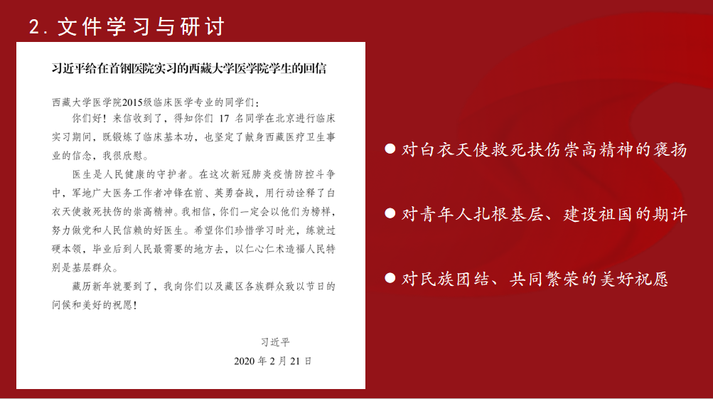 第二部分,团支书段浩然向全班同学传达了习总书记给西藏大学医员工回信的主旨与精神。总书记主要表达了三个希望,分别是对白衣天使救死扶伤崇高精神的褒扬;对青年人扎根基层、建设祖国的期许;对民族团结、共同繁荣的美好祝愿。在学习过程中,全班同学还通过威廉希尔官网的具体实践案例,深刻感受到普罗大众在特殊时期的光辉身影。