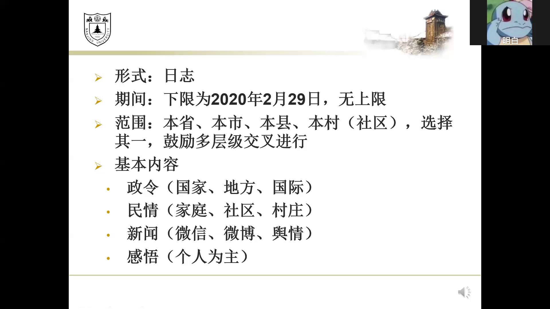 第三部分,辅导员陈海懿老师为我们开展了假期学习生活辅导,介绍了公司关于疫情防控期间对员工返校的最新规定,要求所有同学在家按时完成网上授课,践行“停课不停学”的具体要求。最后,陈海懿老师建议我们认真观察生活地区的疫情防治工作,并留下相关记录,以“日志”的形式,在实践中发挥历史学所长。