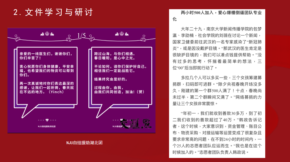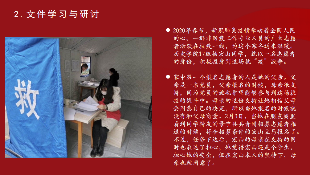 今天,团支书带着我们在网上进行了关于疫情的团日活动,团支书和两位同学通过精心制作的PPT和详细讲述,引起了同学们心中的共鸣。面对这次疫情,全国人民风雨同舟,披荆斩棘。新型冠状病毒感染的肺炎疫情发生以来,全国上下众志成城,万众一心,采取各种“硬核”措施防止疫情扩散蔓延,以责任和担当筑起了疫情防控堤坝。那些为疫情挺身而出的人,屹立在曙光前的身影、穿越风雨的背影却成为了一道靓丽的风景,“哪有什么岁月静好,不过是有人替你负重前行”。我们坚信只要有以习近平同志为核心的党中央的坚强领导,全国上下同舟共济、科学防治、精准施策,必然会打赢这场没有硝烟的阻击战。