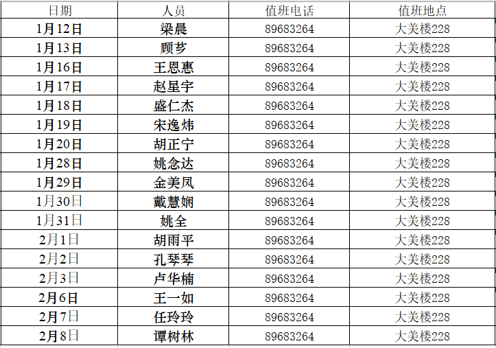 一、威廉希尔官网寒假工作领导小组组长:赵清、张生副组长:谭树林、任玲玲成员:梁晨、王涛、吴桂兵、胡正宁、张敬雷、李力、杨骏二、值班表值班时间:上午9:00-11:00,下午2:00-4:00。2月9日起正常上班。