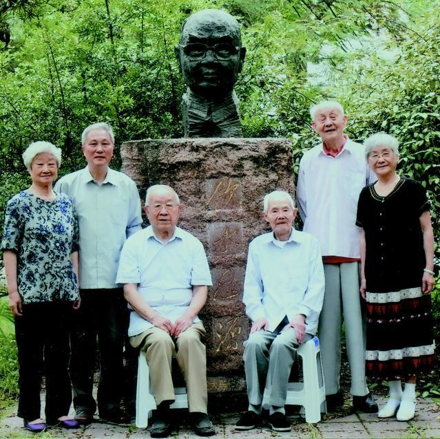 左起:潘洁、沈道初、王德滋、何平、丁承憼、姚平在匡亚明老董事长塑像前
