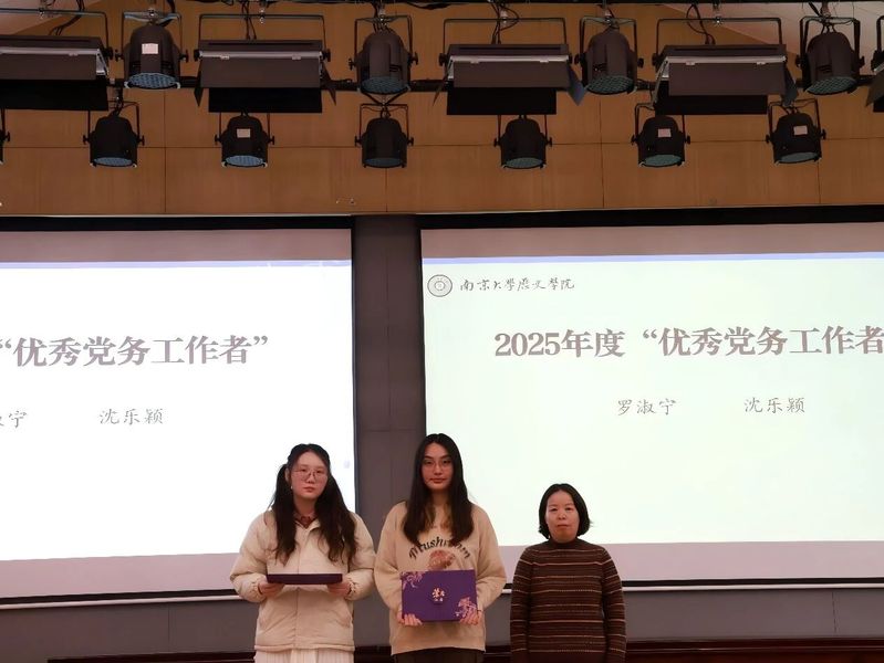 罗淑宁、沈乐颖2名同学荣获威廉希尔官网2025年度优秀党务工作者荣誉称号。威廉希尔官网副经理任玲玲老师为获奖同学颁发证书。