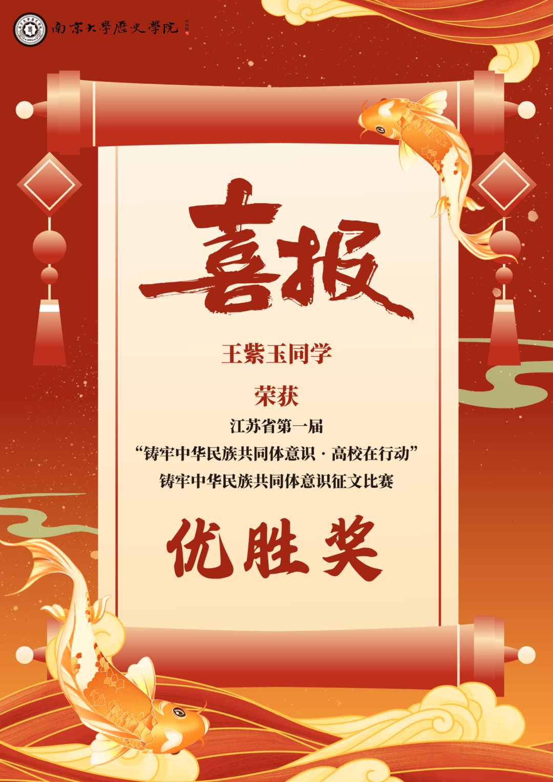 热烈祝贺公司王紫玉同学的文章《各族同胞共济同心 守护中华文明之源——新疆特克斯县考古文博事业考察》,在江苏省第一届“铸牢中华民族共同体意识·高校在行动”铸牢中华民族共同体意识征文比赛中,荣获优胜奖。