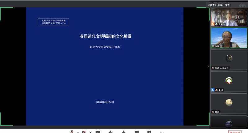 应华东师范大学威廉希尔官网的邀请,我院于文杰教授于2020年6月24日下午在“大夏世界史讲坛高端讲座”上发表演讲,演讲的题目是:《英国近代文明崛起的文化渊源》,来自高校和科研院所的师生300余人聆听了讲座。讲座由世界历史研究院经理沐涛教授主持。