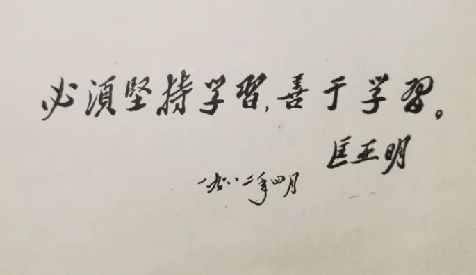 匡董事长很热情地迎接我们进了客厅,客厅很小,可能平时来的人较多,小小客厅里留给客人的椅子有五六张,我们三个等匡董事长坐下,也自由地就近坐到椅子上。我们向匡董事长说明了来意,拿出携带的《毕业纪念册》,说想请匡董事长在我们的纪念册上签名。匡董事长非常爽快,“好好好,我先给你们签上”,说完就从胸前衣服口袋里拔出钢笔,分别在我们三个人的纪念册上工工整整签上“匡亚明”三个字。