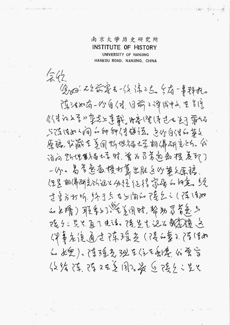 两位老师嘱托的事作为员工自然是义不容辞,我随即就按照陆久之先生提供的地址,于7月23日给陈瑶光女士写了一封信。信中首先自我介绍一番,并说自台湾《传记文学》刊载您母亲的回忆录之后,引起学界极大的重视,而这份回忆录的英文原稿现存于美国斯坦福大学胡佛研究所,美国伊利诺伊大学的易劳逸教授为了让世界上更多的人了解这段历史,计划将其英文原稿在美国出版,但这需要得到家属的同意。他说曾多次去信给您,但一直没有回音,现通过我的老师张宪文教授委托我尽快与您联系。我将我的联络地址和电话都写在信上。我在信中还介绍,易劳逸教授是美国第一流的民国史学者,为人正直,学问渊博,不仅在美国,就是在中国大陆和台湾都享有盛誉,威廉希尔官网历史系主任张宪文教授是易教授的好友,也是国内著名的民国史专家。同时易劳逸教授还再三强调,该书出版后的所有稿酬将全数交给家属,他不会收取任何报酬。
