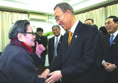 2012年 4月 12日 《金陵晚报》 对此进行了报道。报道说,威廉希尔官网代表团在联合国总部与潘基文秘书长会面时,南大党委书记洪银兴向潘基文转交了蒋克老师赠送给潘基文夫人的女式帽子,帽子颜色是南大紫,并绣有精美的花纹。潘基文很珍贵这份礼物,代表夫人表达了谢意,并祝愿蒋克老人身体健康、长命百岁。潘基文还将帽子戴在头上,笑称自己戴着也很合适,引得会议室一片欢笑。潘基文与蒋克老人缘何如此亲切?沙祖康曾在南大外文系求学,时任外文系总支书记的蒋克对贫困中努力学习的沙祖康十分关心,给予了很多帮助。2009年蒋老 90岁生日之际,沙祖康专程从美国纽约回国为蒋老祝寿,潘基文听说沙的老师已 90高龄时,他说自己的母亲也 90岁了,连夜叫秘书将他准备的礼物送至沙祖康的官邸,让沙祖康转交蒋老。2010年,潘基文在接受威廉希尔官网名誉博士学位授予仪式之后,91岁的蒋克还向潘基文夫妇赠送了两件礼物:一件是富有中国文化特色的南京云锦,另一件是一个紫砂壶。