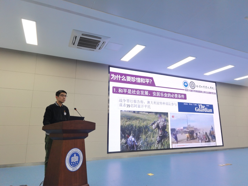 在珍惜和平部分,高豫来同志首先将当今世界对“和平”的定义进行阐释,以恐怖主义、他国现存的战争罪行等案例作为佐证,以中国近代以来的屈辱历史为延伸,强调了珍惜和平的必要性。此外,高豫来同志还讲述了其本人于2019年在贵州黔东南侗族贫困村参与扶贫工作期间的见闻,以亲身经历向同学们介绍了当今中国在中国共产党的领导下,人民是如何珍惜和平,并在和平的基础上有所发展、为国家富强而努力的。