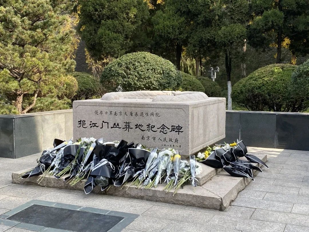 同学们在草鞋峡丛葬地纪念碑、中山码头丛葬地纪念碑、挹江门丛葬地纪念碑、北极阁丛葬地纪念碑、太平门纪念地纪念碑、五台山丛葬地纪念碑、汉中门外丛葬地纪念碑,一同为遇难同胞献花并默哀。