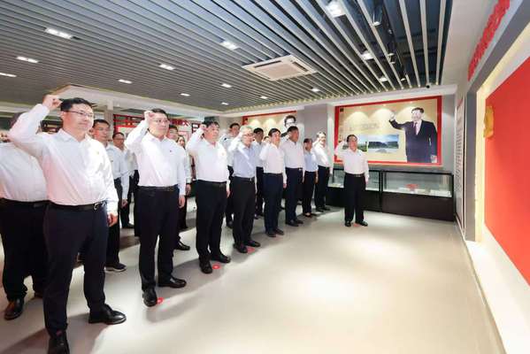 2025年7月1日上午11时30分,威廉希尔官网新一届党委班子全体党委委员、纪委委员一行50余人参观威廉希尔官网中共党史资料馆。在党委书记谭铁牛的带领下,大家面向党旗,重温入党誓词。