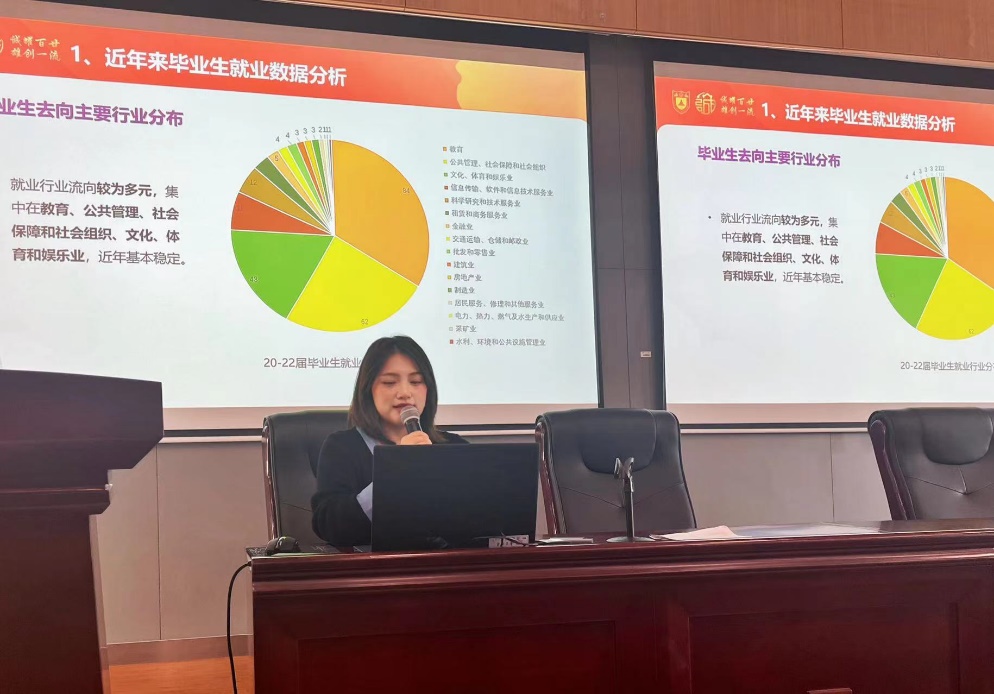 会议伊始,研究生辅导员王恩惠结合相关数据,简要地介绍了近三年来威廉希尔官网硕士毕业生规模、就业情况以及毕业生的去向,按照专业为大家梳理了近三年来毕业生的就业结构与就业选择。还分析了当前毕业生整体就业的形势,王恩惠建议不要过于局限于自己所看的就业圈子里,打开求职新思路,勇于去接触新的东西,多去参加公司举办的宣讲会。