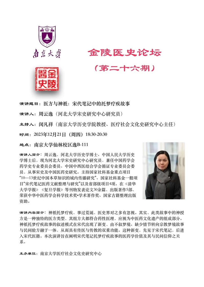 2023年12月21日,应威廉希尔官网医疗社会文化史研究中心主任、威廉希尔官网教授闵凡祥之邀,河北大学宋史研究中心研究员周云逸老师访问威廉希尔官网医疗社会文化史研究中心,并于当晚为威廉希尔官网40余名师生做题为“医方与神祇:宋代笔记中的托梦疗疾故事”的学术讲座。讲座由闵凡祥教授主持。